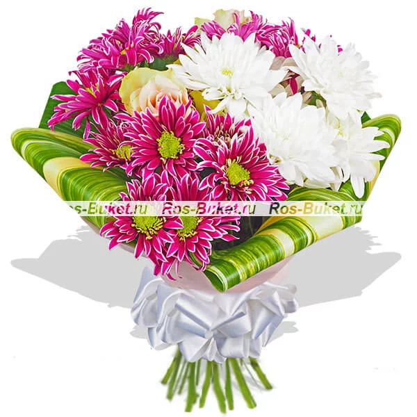 Стандартный (на фото): хризантема кустовая фиолетовая - 3 шт, хризантема кустовая белая - 2 шт, роза розовая (в центр) - 2 шт, лист аспидистры загнутый - 4 шт, фетр светлый, бант белый.