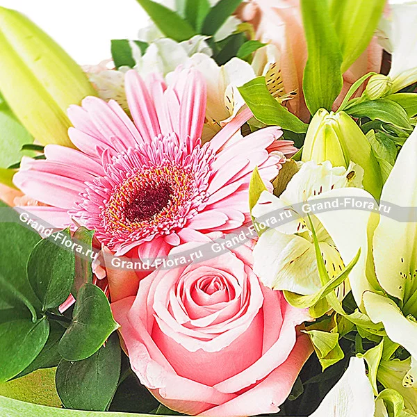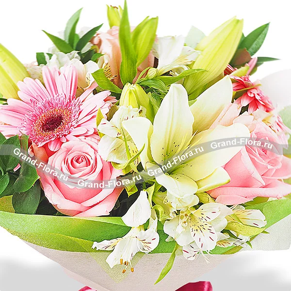 Букет составлен из  розовых роз сорта Ангажемент, нежно – розовых гербер, сливочно – белой альстромерии и нежнейших белых лилий, в окружении салала. Завершает композицию зеленый фетр и лента. Высота букета  40-50 см, а диметр зависит от выбранного варианта букета, которых представлено четыре : уменьшенный, стандарный,люкс и делюкс. В среднем букет в диаметре 25 см. Обращаем Ваше внимание, что состав и упаковка букета могут отличаться.