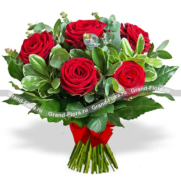 5 роз: роза красная - 5 шт., рускус - 3 шт., эвкалипт - 2 шт., упаковка, бант красный.